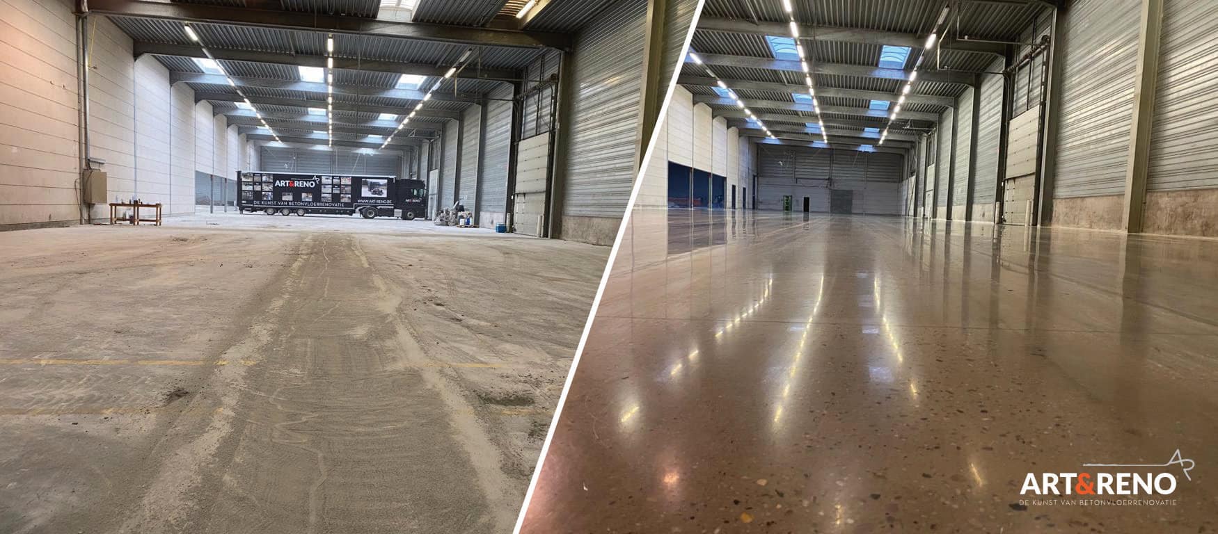 Art & Reno heeft de reparaties uitgevoerd en na slijpen en polijsten heeft de klant weer een nieuwe vloer.