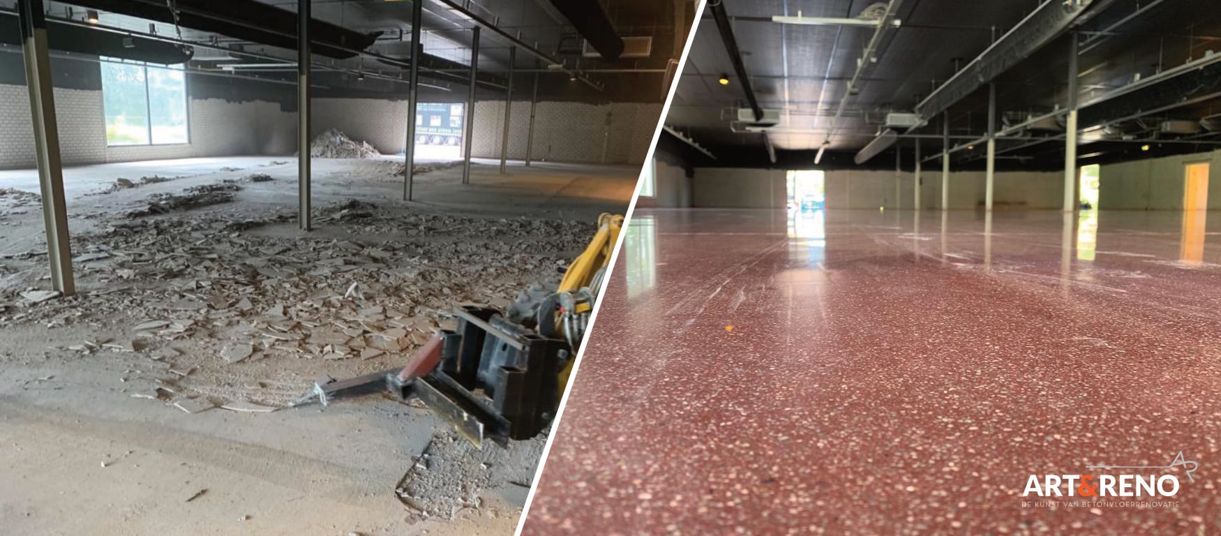 Het Art & Reno Team heeft de tegels op een zeer voorzichtige manier verwijderd, waarna we de rode betonvloer hoogglans hebben gepolijst met dit schitterend resultaat.