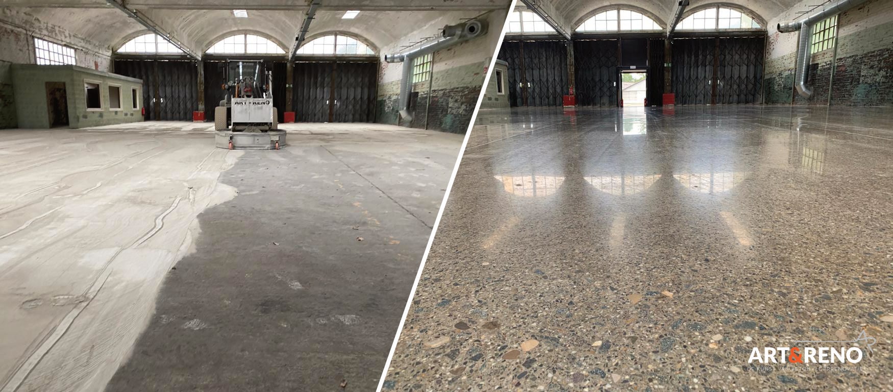 Art & Reno heeft de vloer eerst mooi vlak geslepen daarna hoogglans gepolijst tot korrel 3000.
