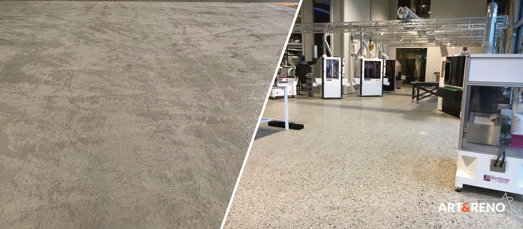 Dit bedrijf heeft bij het bouwen van zijn nieuwe pand gekozen voor het Art & Reno Team omdat de zaakvoerder al zeer goede ervaringen had met het polijsten van de vloeren in zijn bestaande panden. Zij hebben ervoor gekozen om een betonvloer te storten waar we de kiezel in het zicht hebben geslepen zodat we een terrazzo of granito vloer krijgen. Dit geeft een bijzonder mooi resultaat.