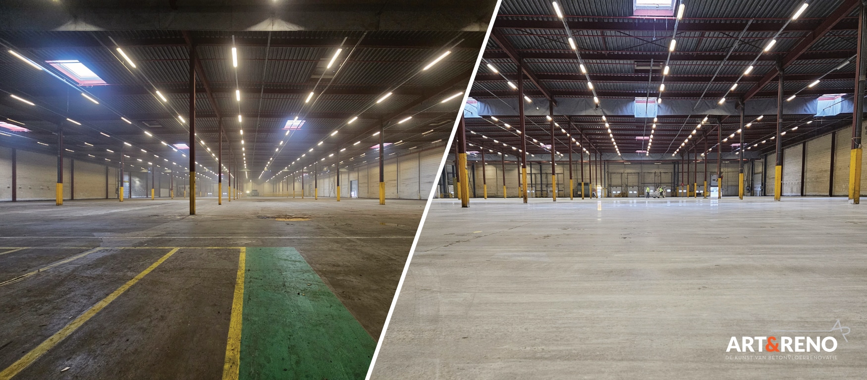 Dit zijn oude magazijnen van een groot distributiecentrum. De vloeren waren vervuild en zeer ongelijk.